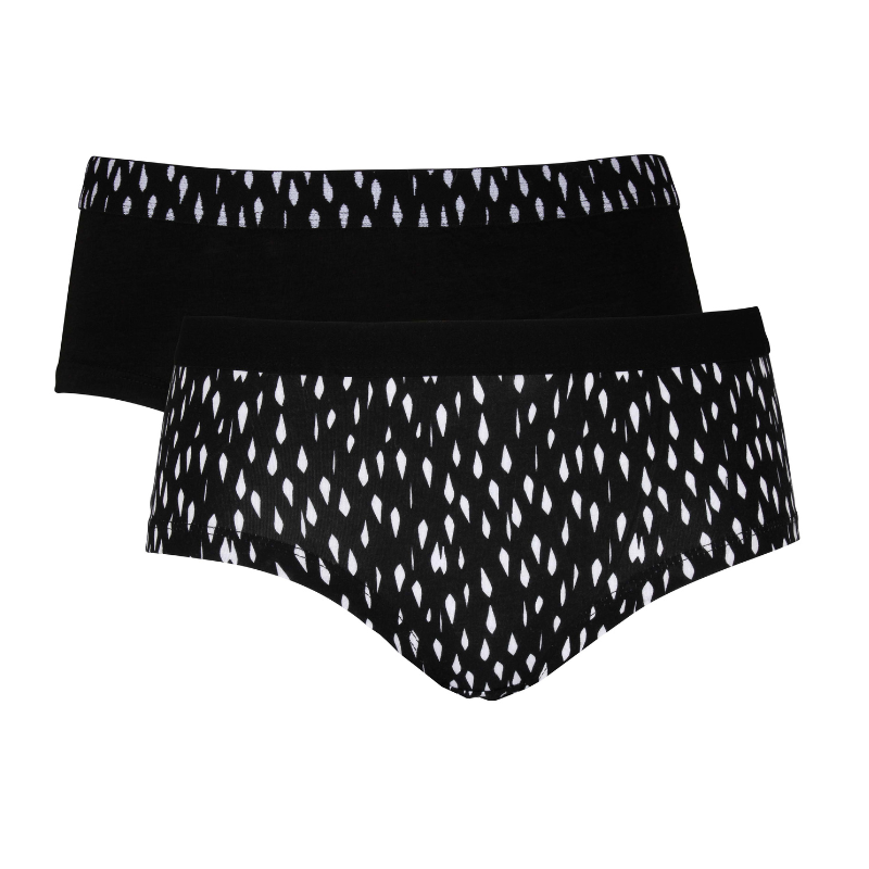 I den här förpackningen får du ett par svarta trosor med prickig resår och ett par prickiga trosor med svart resår i midjan. Trosorna är i så kallad ”Hipster- modell”.