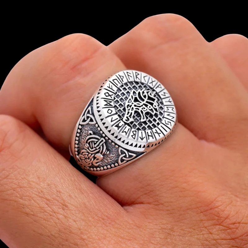 925 Sterling Silver Viking Wolf and Norse Runes Ring