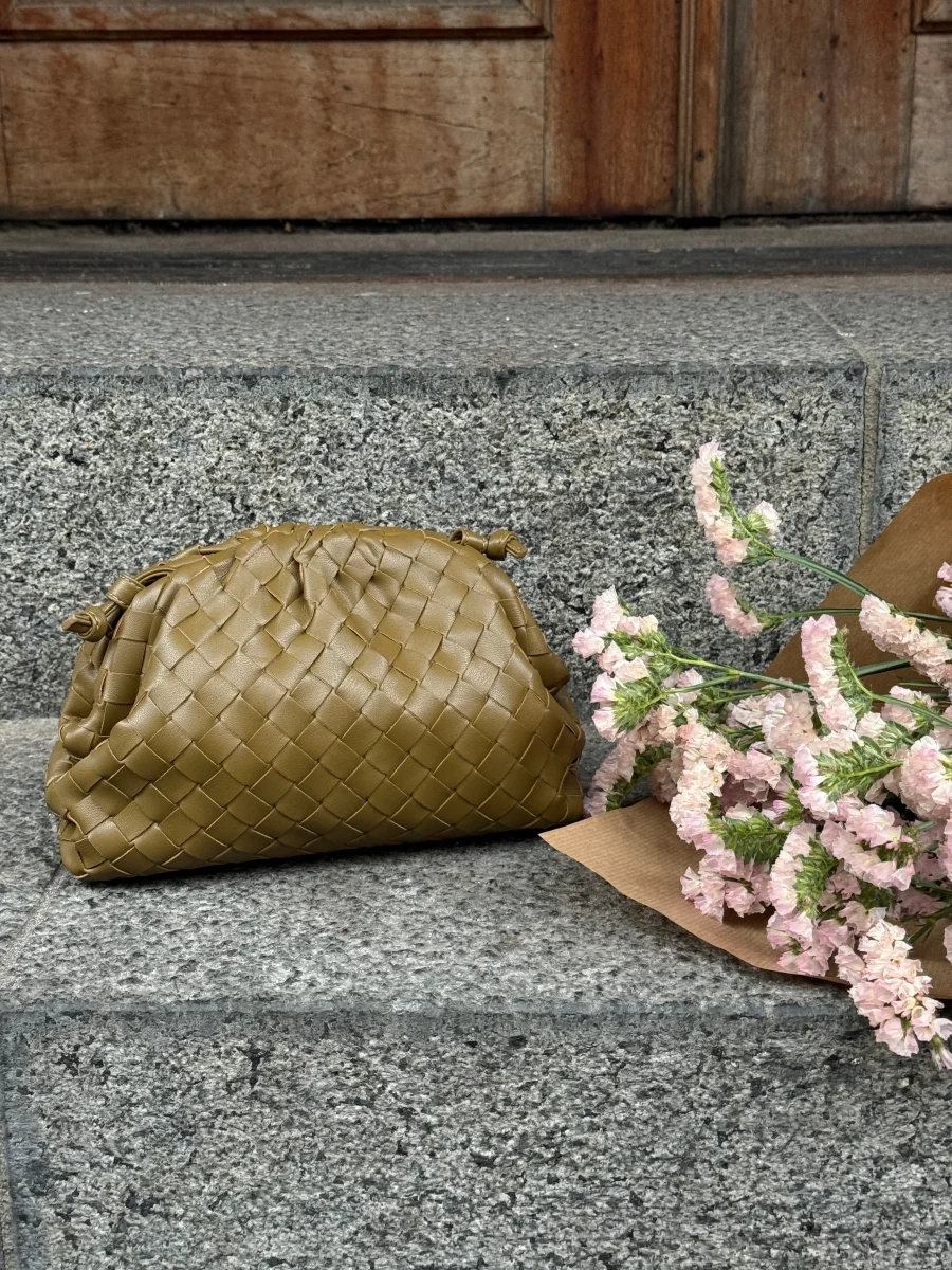 Finaste olivgröna clutch med flätad struktur och mjuk form. Den har en lätt axelrem och en enkel, modern design som gör den lätt att använda både till vardags och kväll.