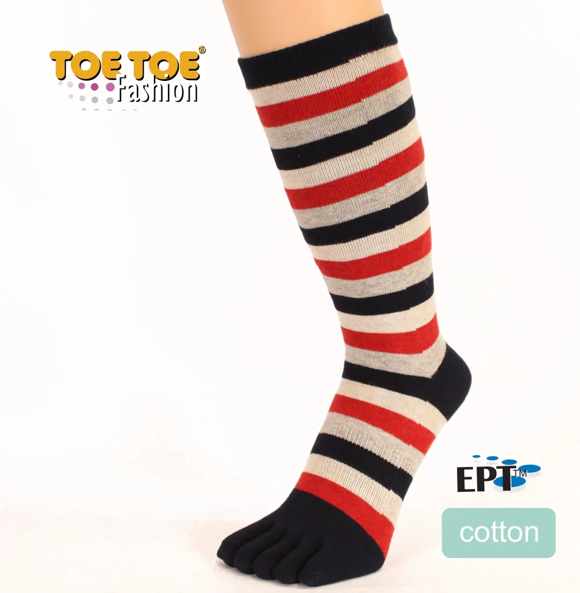 Tåstrumpor randiga i mörkt marin, rött och ljusbeige och grå.