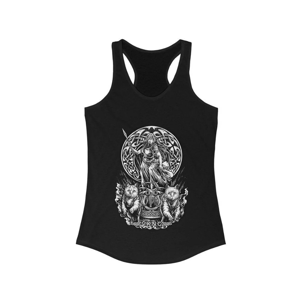 Modern Viking witches will love this Freya racerback singlet which features the goddess taking on the world in her chariot drawn by cats. Available in black and white.