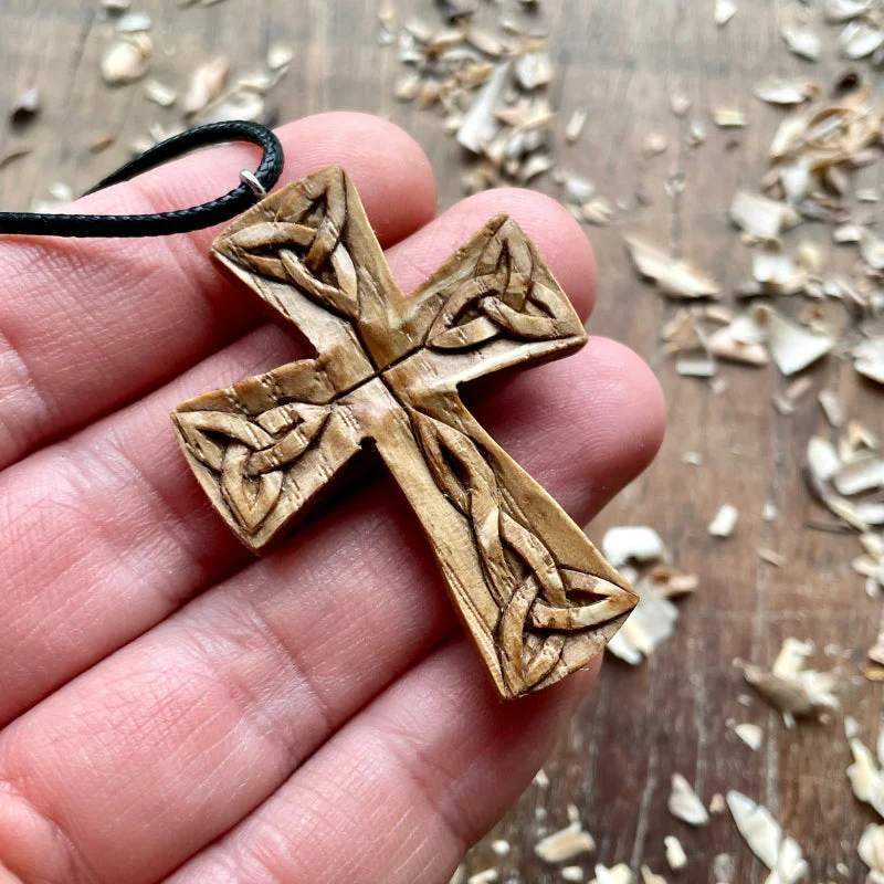 Handcarved Unique Wood Celtic Cross Triquetra Pendant