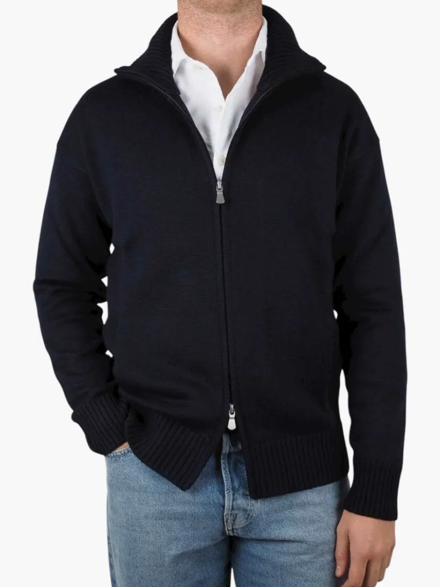 Heavy Knitted Merino Wool Full Zip Sweater Navy