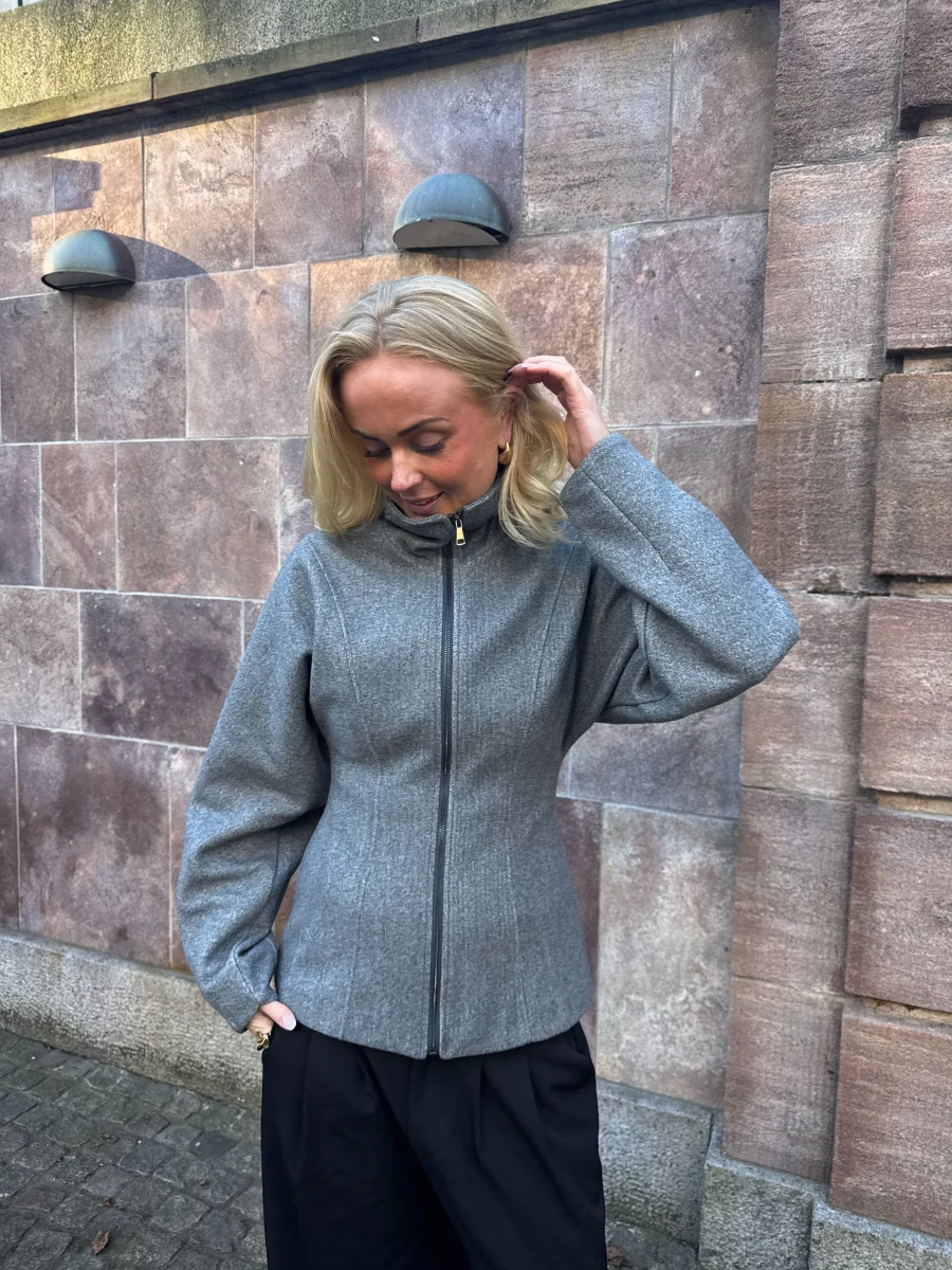 En stilren och tidlös jacka i ljusgrå med ett minimalistiskt uttryck. Jackan har hög krage, dragkedja framtill och en lätt figursydd passform som ger en smickrande och modern look. Den är tillverkad i ett mjukt material som gör den perfekt både för vardagsbruk och finare tillfällen.
