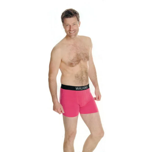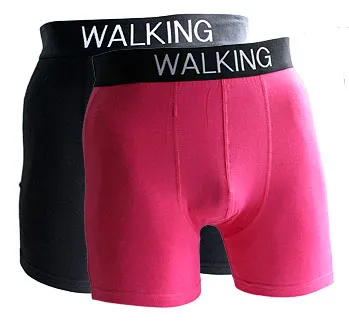 Två par kalsonger i boxermodell varav ett par är helt enfärgat svarta och det andra paret är rosa. Båda har texten ”Walking” i vitt i resåren i midjan.