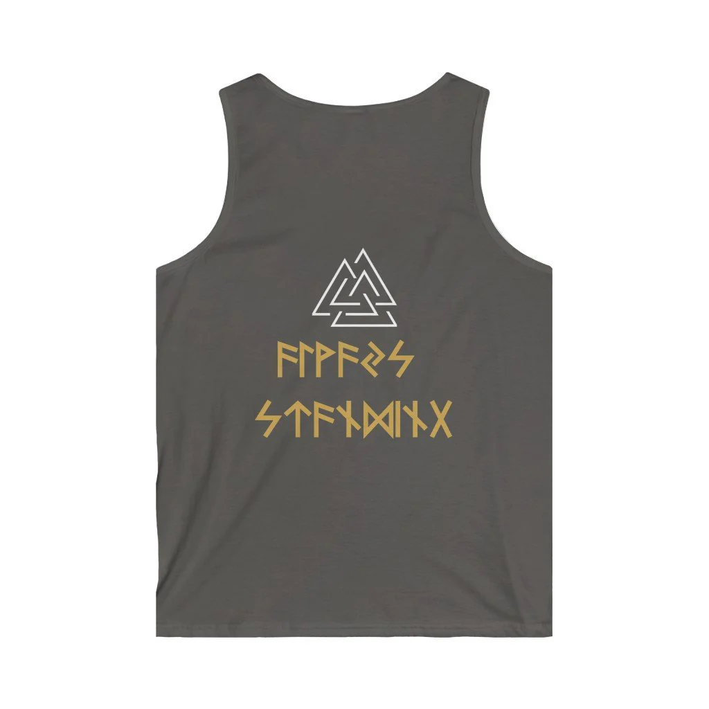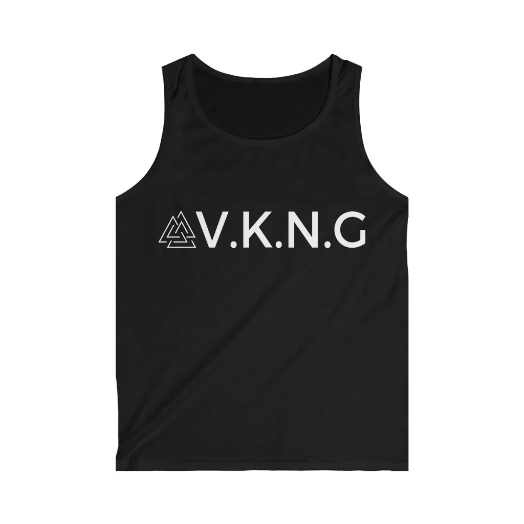 The sleeveless muscle t-shirt features the VKNG logo with the Vlaknut, the biking symbols of Valhalla. It also has the mantra ”always standing” written in the runes.