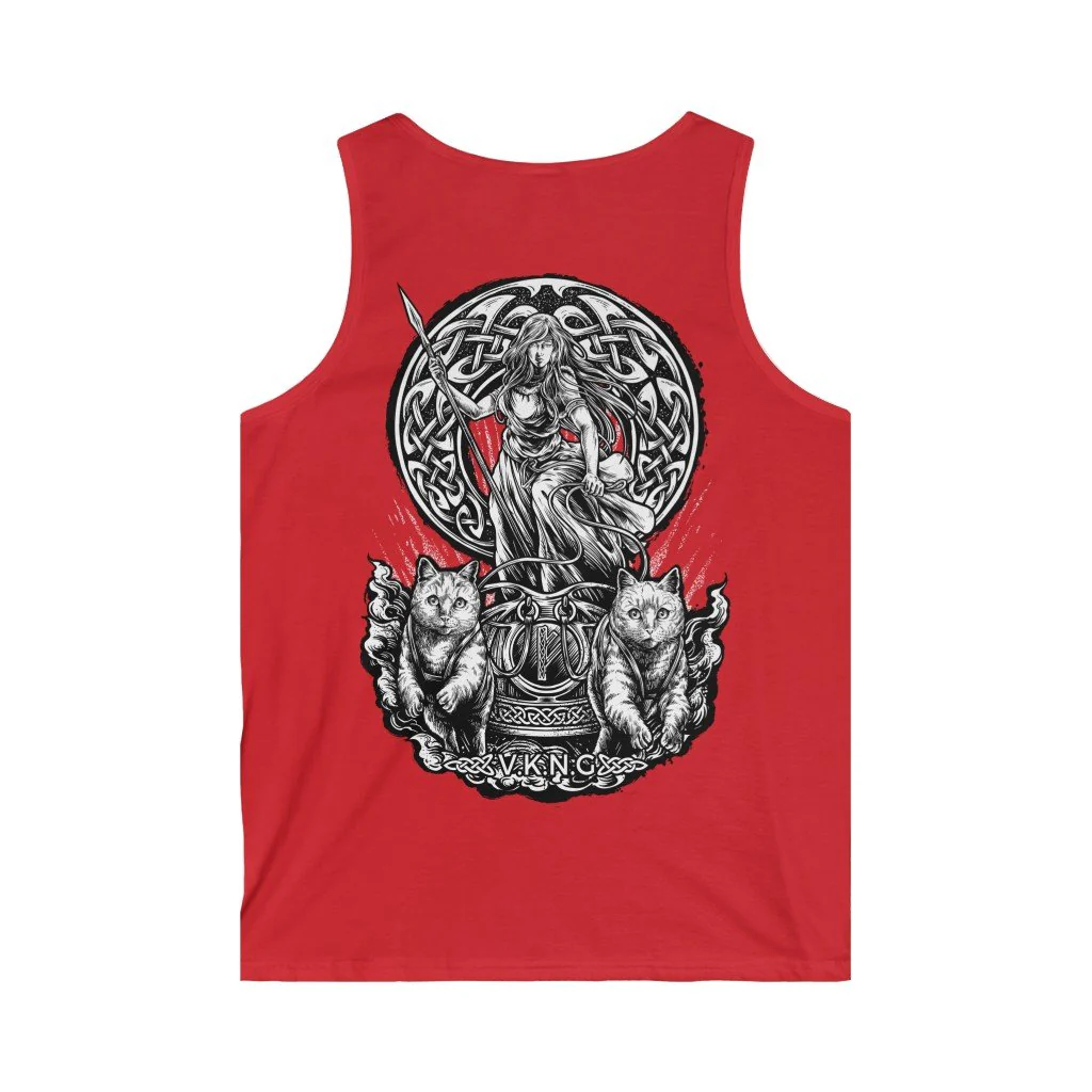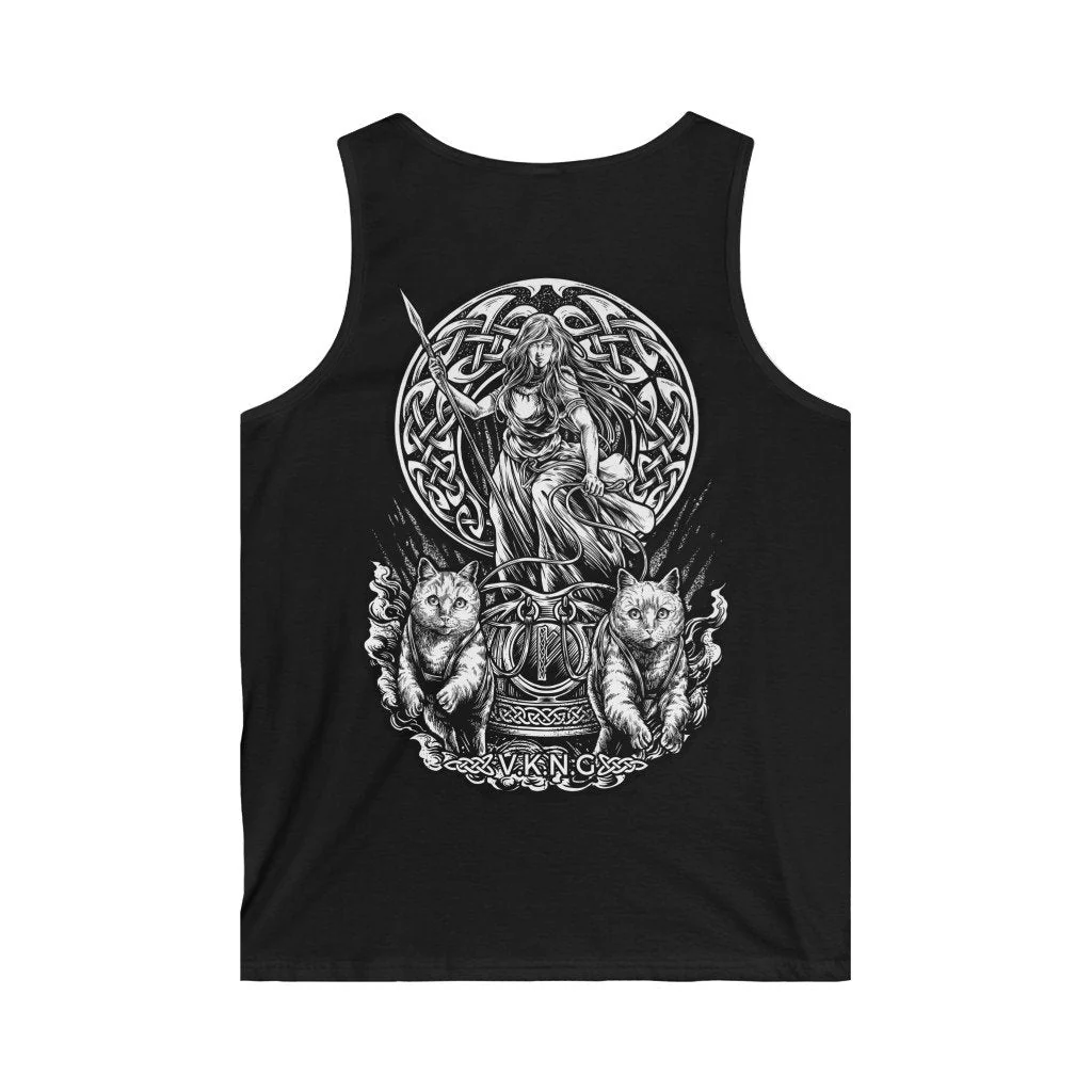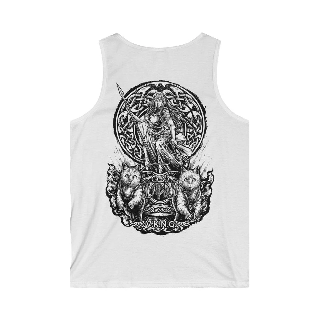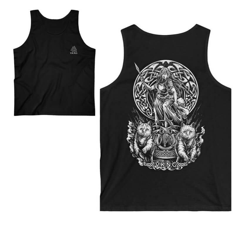 Show your love for the goddess with this VKNG muscle shirt with a classic Freya design, in her chariot pulled by two cats.
