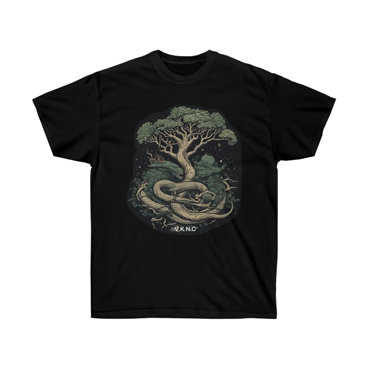 The Yggdrasil encircled by the serpent Jormungandr V.K.N.G™ T-Shirt is a powerful representation of one of the most iconic tales in Norse mythology. Yggdrasil, the World Tree, stands as the backbone of the cosmos, while Jormungandr, the Midgard Serpent, encircles the world in its vast coils, representing the cyclical nature of life and the eternal struggle between order and chaos.