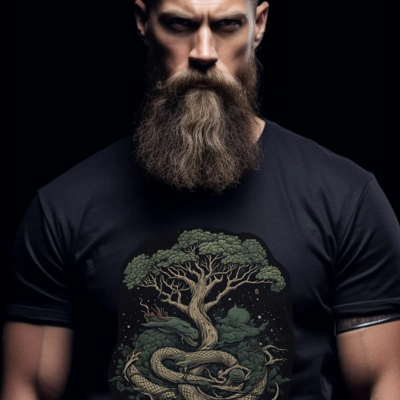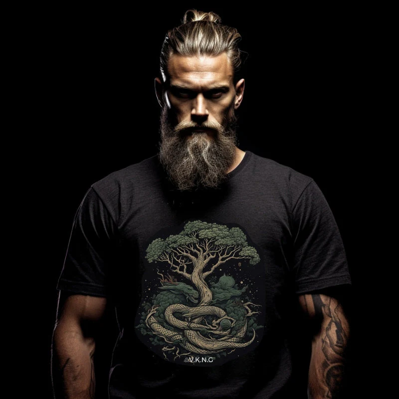 This T-shirt captures the essence of this legendary tale, offering wearers a piece of the ancient world. The intricate design, which showcases the immense World Tree with the formidable serpent wrapped around it, serves as a reminder of the balance of forces in the universe and the interconnectedness of all things.