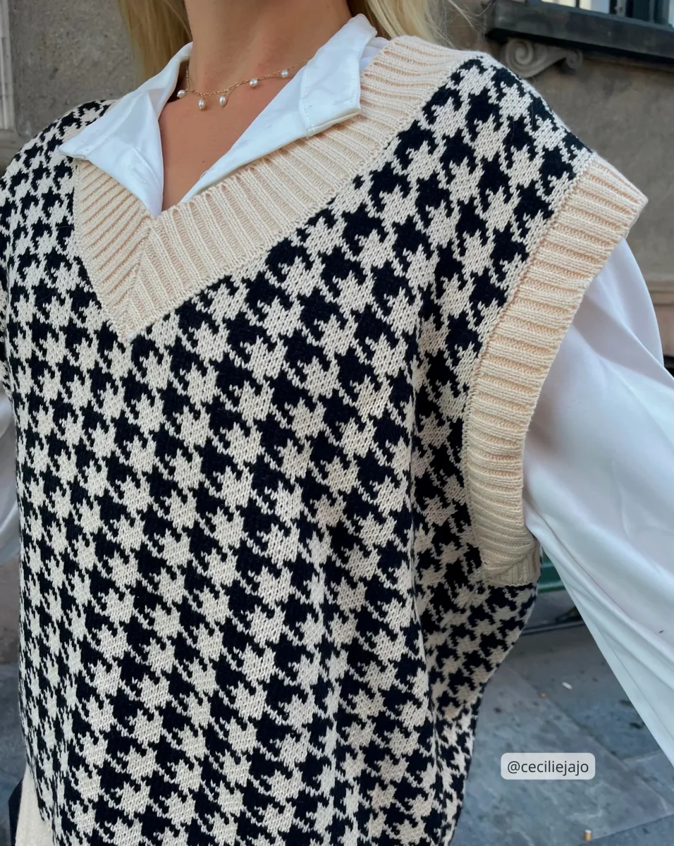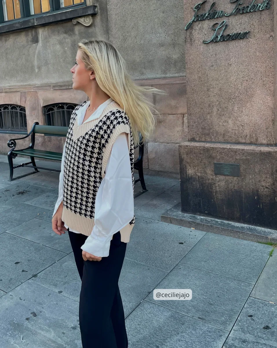 Fin rutig väst med v-ringning, i en lös passform. Verkligen bra kvalitet, med en fin ärmlös design. Den passar bra både med en t-shirt under eller en skjorta, men endast fantasin sätter gränser för hur den kan stylas. Vesten är gjord av tjockt tyg, så den passar bra för de senare höstkvällarna.